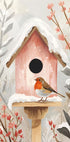 A charming winter motif by Ohkimiko: a small birdhouse covered in snow, where a lively red sled finds shelter among green branches and fine plants. The scene exudes calm, presence and December coziness – a quiet reminder to give nature space and food in the cold months. A poetic detail for the living room or entrance hall. Perfect for winter comfort.