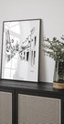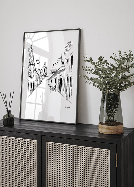 Wake up in Portugal with an elegant travel sketch by Awol Art Alex: a sunlit Portuguese street with cafe tables, narrow facades and a discreet church tower on the horizon. Fine, minimalist lines, lamps, windows and doors create depth and perspective – a calm morning atmosphere from Lisboa to Porto. Perfect for lovers of Portuguese streets and travel dreams.