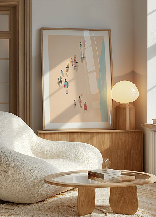A simple and peaceful illustration of beachgoers heading towards the sea, painted in soft pastel colours. Perfect for creating a light and relaxed atmosphere in summer homes or beach houses.