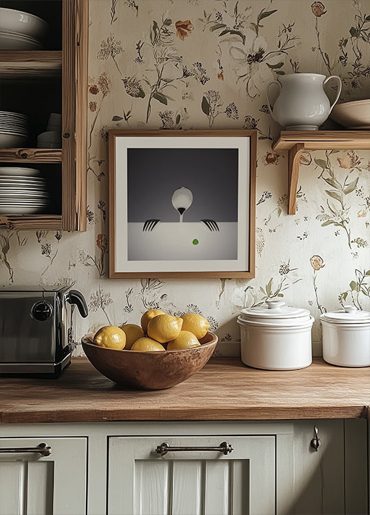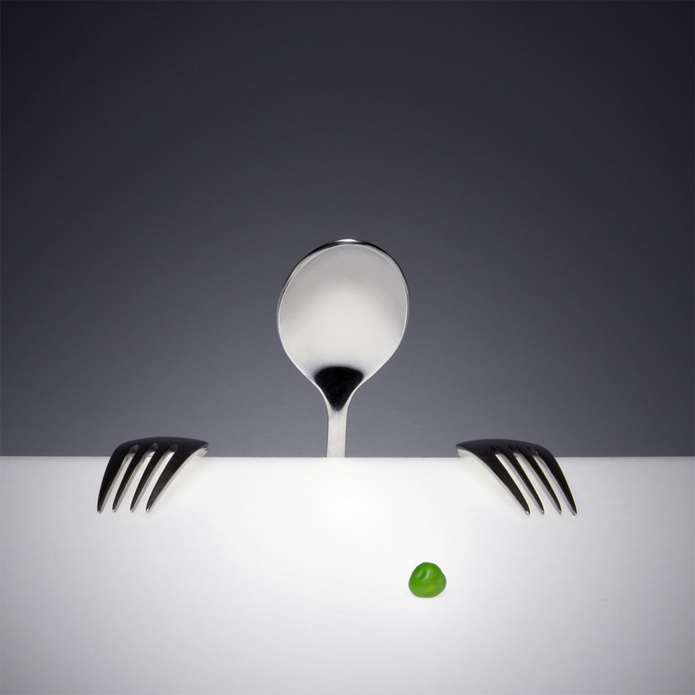 A playful and elegant still life poster by Wieteke de Kogel: shiny forks and spoons become small, eager hands reaching for a single green pea on the table. The clean composition, the matte metallic shine and the popping point of green create humour, excitement and modernist charm – perfect for the kitchen, dining area and conversations.