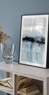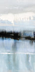 A poetic watercolor landscape by Mareike Böhmer: hazy blue tones flow together like sea and sky, where light clouds are reflected in still water. Minimalist contours and delicate transitions create calm and depth, a Nordic-Japanese atmosphere that invites contemplation and stylish simplicity. Abstract waves suggest coast and fog.