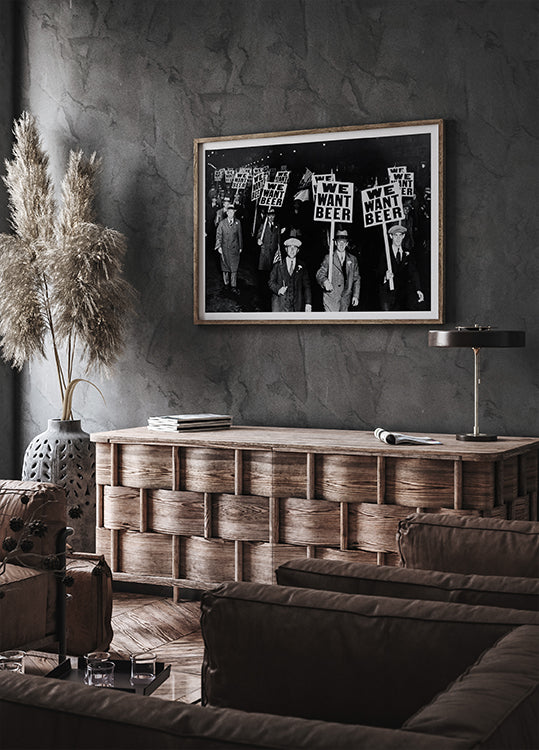 A remarkable black and white vintage photograph capturing a historic protest during the Prohibition era. Protesters hold signs saying "We Want Beer," a powerful symbol of the public's demand for alcohol in the early 20th century. Perfect for history buffs, vintage photography, and unique bar decor.