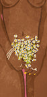 Daisy Bloom Nude Poster is a bold yet poetic illustration that celebrates femininity, self-love and natural beauty. It shows a nude woman with brown skin holding a delicate bouquet of white daisies. The work combines warm earth tones with a vibrant pink textural background, and the detailed jewelery and fresh floral bouquet evoke themes of strength, gentleness and sensuality. A powerful statement for modern interiors, art galleries or intimate spaces.