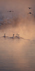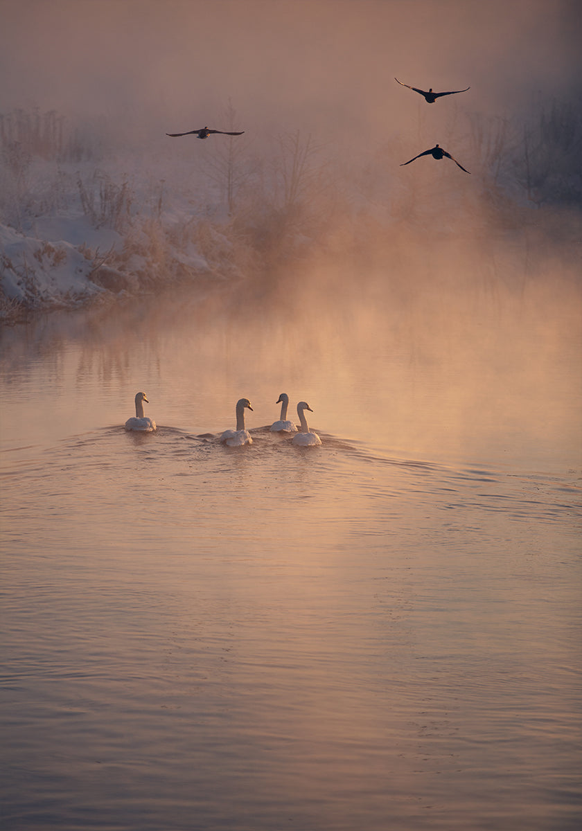Swans glide silently over a mirror-like lake, where the morning fog lifts and lets the first, soft light caress the water. In the still winter air, wingbeats and reflections draw a poetic encounter between closeness and distance. Where the Fog Didn't Reach by Oskar Ulvur captures the quiet magic of the moment.