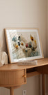 This artwork shows delicate watercolor flowers in soft hues on a textured background. The ethereal composition captures the fragility and elegance of nature, making it perfect for flower art enthusiasts and home decor inspiration.