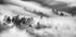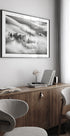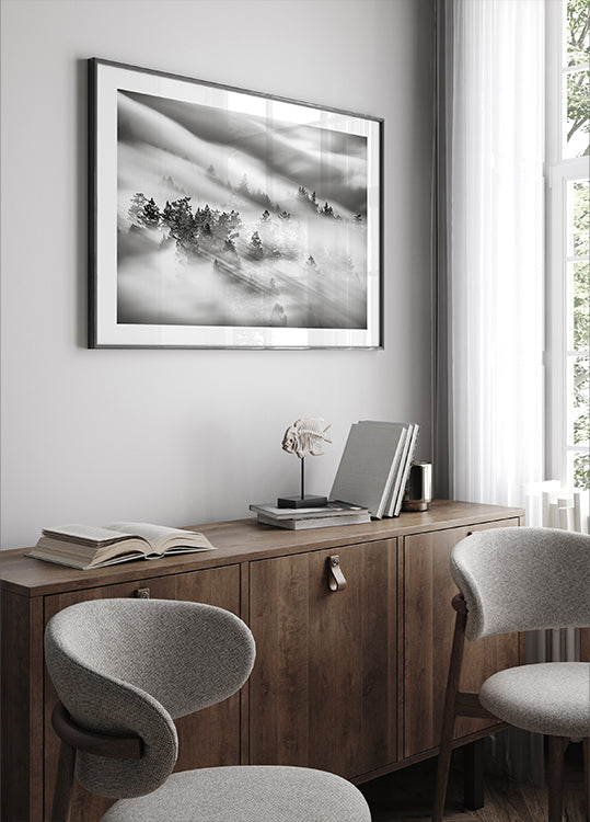 A timeless, monochrome landscape scene by Johnny Zhang: mist hovers between snow-covered mountainsides and dark pine trees, where sky and horizon merge into quiet tranquility. The contrasts are soft, the lines clean, and the motif captures the poetry of winter—a serene focal point for spaces that seek balance and depth.
