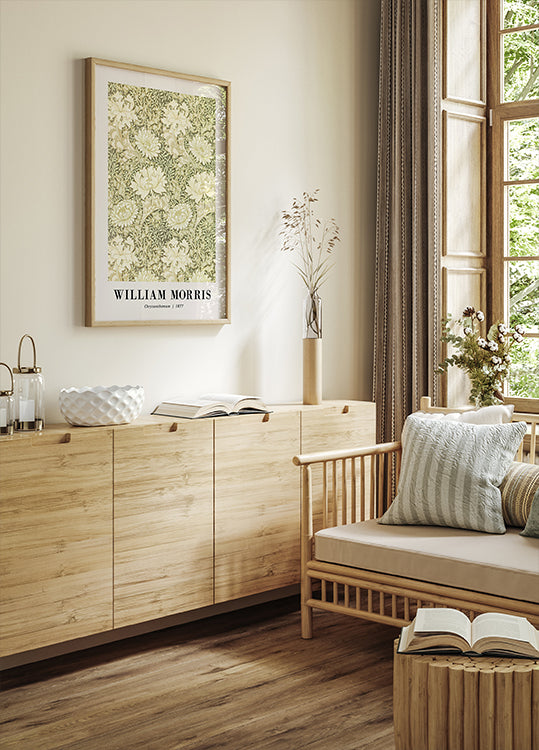 A beautiful botanical poster featuring the "Chrysanthemum Pattern", designed by William Morris in 1877. The detailed flowers and lush foliage create an elegant, nature-inspired composition that perfectly captures the style of the "Arts and Crafts Movement". Ideal for those who love vintage design, historical patterns and timeless aesthetics.