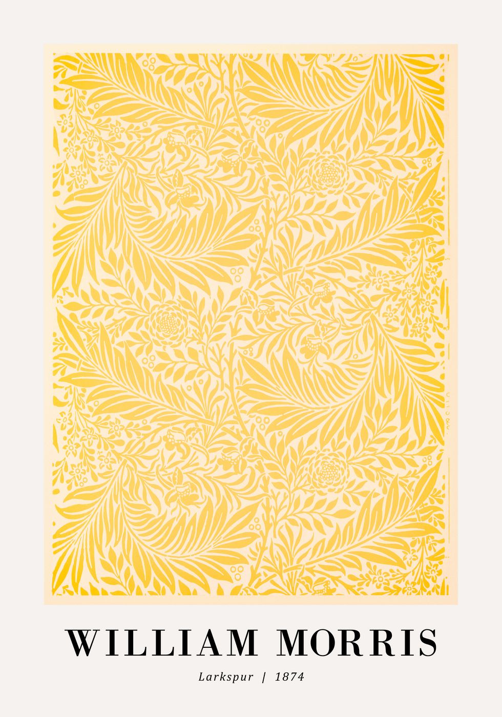 A timeless botanical poster featuring "William Morris' Larkspur pattern from 1874". This beautifully detailed floral pattern features elegant leaves and flowers in a classic vintage style. Perfect for any "nature-inspired, vintage or art nouveau home".