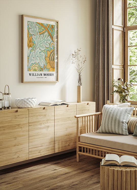 A bright and ornate pattern by William Morris. The St James pattern (1881) features elegant acanthus leaves, stylized flowers and soft lines in mint green, ochre and pale blue. A superb example of Morris's ability to translate the beauty of nature into harmonious design.
