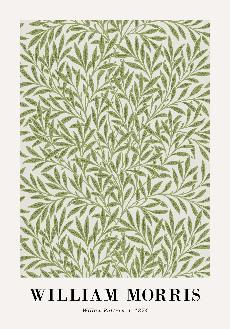 A timeless botanical poster featuring the iconic *Willow Pattern*, designed by William Morris in 1874. The delicate green leaves create a fascinating, nature-inspired pattern that perfectly captures the style of the *Arts and Crafts movement*. Ideal for those who love vintage design, classic craftsmanship and natural patterns.