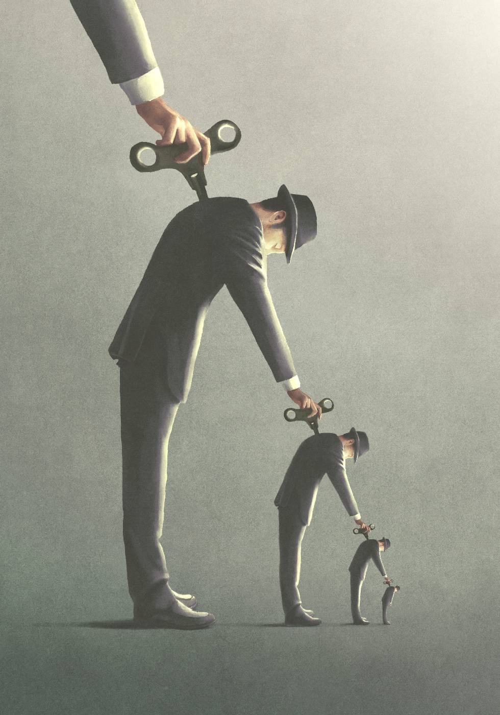 A visual story about men in an endless chain, pulling each other up with winding keys. The work questions human freedom in a system characterized by routine and expectation.