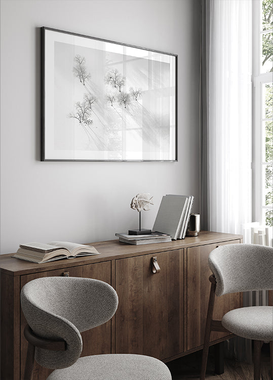 Winter dream – a still ballet by LINGLING GUAN depicts a quiet winter landscape, where the snow settles like a light veil around slender trees. Muted tones and soft, cool lighting create a poetic calm that invites contemplation – a visual ballet of silence and elegance. Perfect for bringing the poetry of winter into the living room.