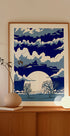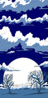An evocative winter poster by Nicholas: a minimalist, moonlit landscape in deep blue tones. Bare trees stand as silhouettes against a dramatic, cloudy night sky, where a large full moon is reflected in the frozen ground. Calm, poetic and perfect for creating peace in the living room, bedroom or office. A stylish eye-catcher.