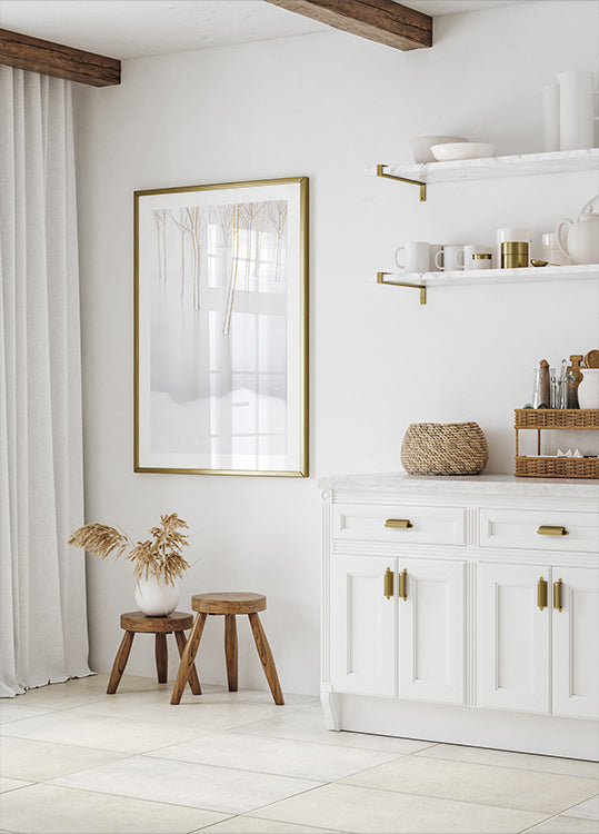 Winter Reflection by Laurentiu Pavel captures the Nordic winter stillness: bare trees stand as graphic silhouettes along the banks, mirrored perfectly in an icy water. The bright, brightly lit atmosphere and the limited palette of white and gray tones create calm, harmony and a meditative depth in the room. A poetic winter landscape that invites contemplation.