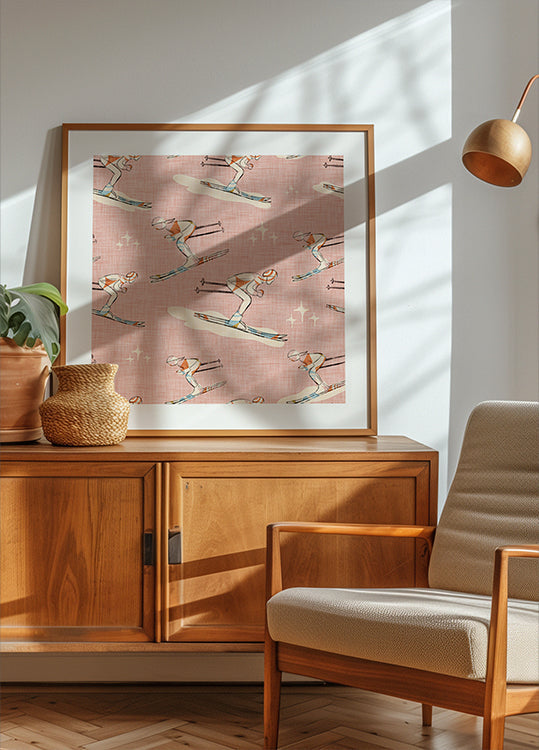 A stylized skier cuts through freshly fallen snow in cool blue tones, surrounded by sharp peaks and dark firs under a sunny sky. Discreet retro typography and clean lines give the poster a timeless, midcentury travel poster vibe—energetic, nostalgic and perfect for both cabin and city. A winter-fresh eye-catcher by Susana Costa.