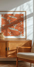 Retro-inspired ski poster in deep blue shades that captures speed and freedom in the mountains: an elegant skier cuts through the snow, with graphic lines, shadows and alpine contours that evoke memories of classic winter posters. A stylish design by Susana Costa, perfect for Nordic decor. The palette of blue and icy shades gives a timeless retro look and brings alpine dreams into the living room.