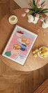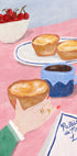A warm tribute to Lisbon: a cozy table scene with black coffee, fresh cherries and crispy pastéis de nata. In a minimalist, retro color palette, the motif invites calm everyday luxury and travel fever. Naive, modern line by the artist Dirkie Nell, perfect for the kitchen, coffee corner and Mediterranean atmosphere.