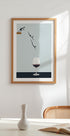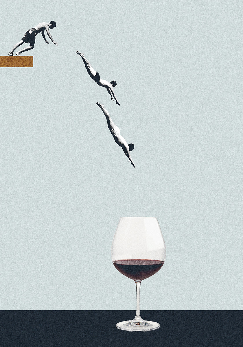 A witty and minimalist art print that shows a perfect dive - right into a glass of red wine. With its playful concept and clean composition, this piece fits perfectly in kitchens, dining rooms or any space that embraces humor with a touch of sophistication. A fun conversation starter for wine lovers and design enthusiasts.